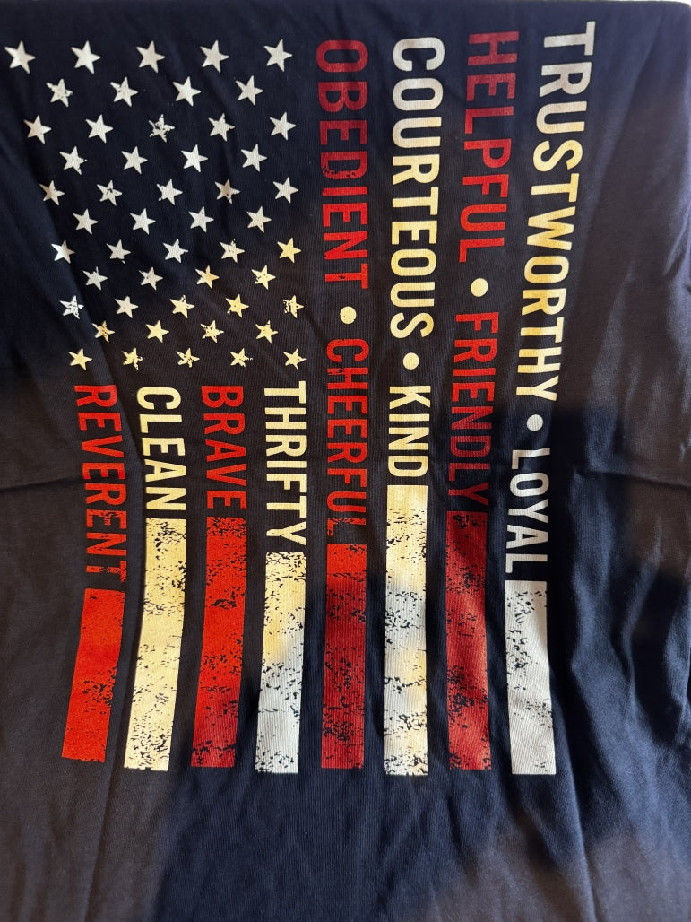 This is the classic Class B shirt, with the front chest logo, and the scout oath and law on the back. This was sold first in Summer of 2025